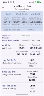 Pro akupunkturisty a praktiky tradiční čínské medicíny představuje aplikace AcuRhythm nezbytného společníka, který prohlubuje přesnost a efektivitu každé terapie. Tento sofistikovaný nástroj vám umožní odemknout potenciál správného načasování bodů, čímž maximalizujete jejich terapeutický účinek. S AcuRhythm získáte přístup k hlubokým výpočtům tradičních metod, jako jsou Nai Zhi Fa, Zi Wu Liu Zhu (systém kmenů a větví, poledne/půlnoc, Adopting Stems, Partner days, Husband/Wife, Same Clan), stejně jako osmi technikám tajemné želvy Ling Gui Ba Fa a osmi technikám vzlétání Fei Teng Ba Fa. Aplikace precizně určuje sezónní body na základě pěti šu bodů, což zajišťuje optimální volbu v souladu s přírodními cykly.