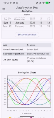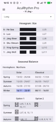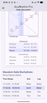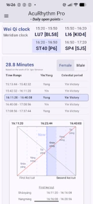 AcuRhythm jde v preciznosti ještě dál. Nabízí detailní analýzu s ohledem na Inter-Generation body s 24minutovými otevřenými body a Wei Qi Clock. Pro maximální přesnost si můžete vybrat mezi místním časem a solárním časem, vypočítaným na základě vaší aktuální zeměpisné délky. Každý bod je popsán obsáhlými informacemi o kanálech, včetně Source, Luo, Xi-Cleft, 5 Shu a Entry/Exit bodů. Integruje také pokročilé techniky pěti elementů, jako je Korean Sa-Am (Čtyři jehly), Pět systémů Dr. Richarda Tana a Metodu šesti kanálů ZangFu Dr. Chao Chena, a také fáze denní bioritmiky Dr. Manaky, čímž poskytuje komplexní pohled na energetické toky.