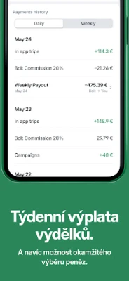 Představte si svobodu řídit si svůj vlastní čas a maximalizovat své výdělky s efektivním partnerem. Aplikace Bolt Driver vám otevírá dveře k dynamickému světu dopravy, kde máte kontrolu nad svým rozvrhem. S námi profitujete z transparentně nízkých poplatků, které zajišťují, že si z každé jízdy odnesete více. Díky široké zákaznické základně společnosti Bolt, která čítá miliony uživatelů po celém světě, máte neustálý přísun cestujících, což znamená stabilní a vysoký výdělečný potenciál. Vaše odměna za vynaloženou práci je vždy včas, s rychlými týdenními výplatami, a navíc máte možnost získávat exkluzivní bonusy a motivující příplatky.