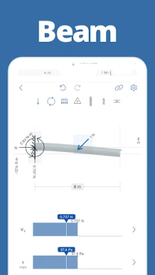 Nejenže uvidíte průhyby a vnější síly, ale **Editor 2D rámů a příhradových konstrukcí** vám poskytne i hluboký vhled do vnitřních namáhání. Obdržíte přehledné diagramy ohybového momentu, smykové síly a průhybu, doplněné o vizualizaci vnitřních ohybových a smykových napětí. S využitím editoru nosníků můžete tato napětí detailně prozkoumat podél celé délky nosníku, stejně jako v rámci vertikální osy jeho průřezu, což vám umožní pochopit rozložení sil s nebývalou přesností.