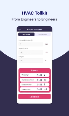 Optimalizace systémů HVAC je klíčová pro efektivitu a komfort v moderních budovách. S touto intuitivní aplikací získají inženýři, technici i studenti výkonný výpočetní nástroj přímo do kapsy, který eliminuje zdlouhavé manuální procesy a minimalizuje chyby. Naše aplikace vám umožňuje bleskově a přesně vypočítat klíčové parametry, jako jsou tlakové ztráty třením v potrubních systémech a vzduchovodech, přesné dimenzování potrubí, požadavky na větrání garáží, zajištění přetlaku na schodištích a odhad tepelných zisků či ztrát. Navíc zvládnete určit dopravní výšku čerpadla a externí statický tlak ventilátoru (ESP) s maximální efektivitou. Jednoduše zadáte požadované vstupní hodnoty a okamžitě obdržíte spolehlivé výsledky.