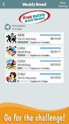 S aplikací Pic-a-Pix získáte přístup k rozsáhlé knihovně čítající 155 bezplatných hádanek, dostupných v barevném i černobílém provedení, s neustále se doplňujícím novým obsahem. Každá hádanka je ručně vytvořena umělci z Conceptis Ltd. s důrazem na špičkovou kvalitu a unikátní řešení, a to v rozsahu od velmi jednoduchých po super náročné úrovně obtížnosti a s velikostí mřížky až 30x45 (45x60 pro tablety). Zdokonalujte své logické schopnosti, posilujte kognitivní dovednosti a užijte si hodiny intelektuální výzvy. K dispozici máte neomezené možnosti kontroly, nápověd a zpětných kroků, spolu s režimem značení čtverců, podporou tmavého režimu a automatickým zálohováním pokroku na Google Drive.